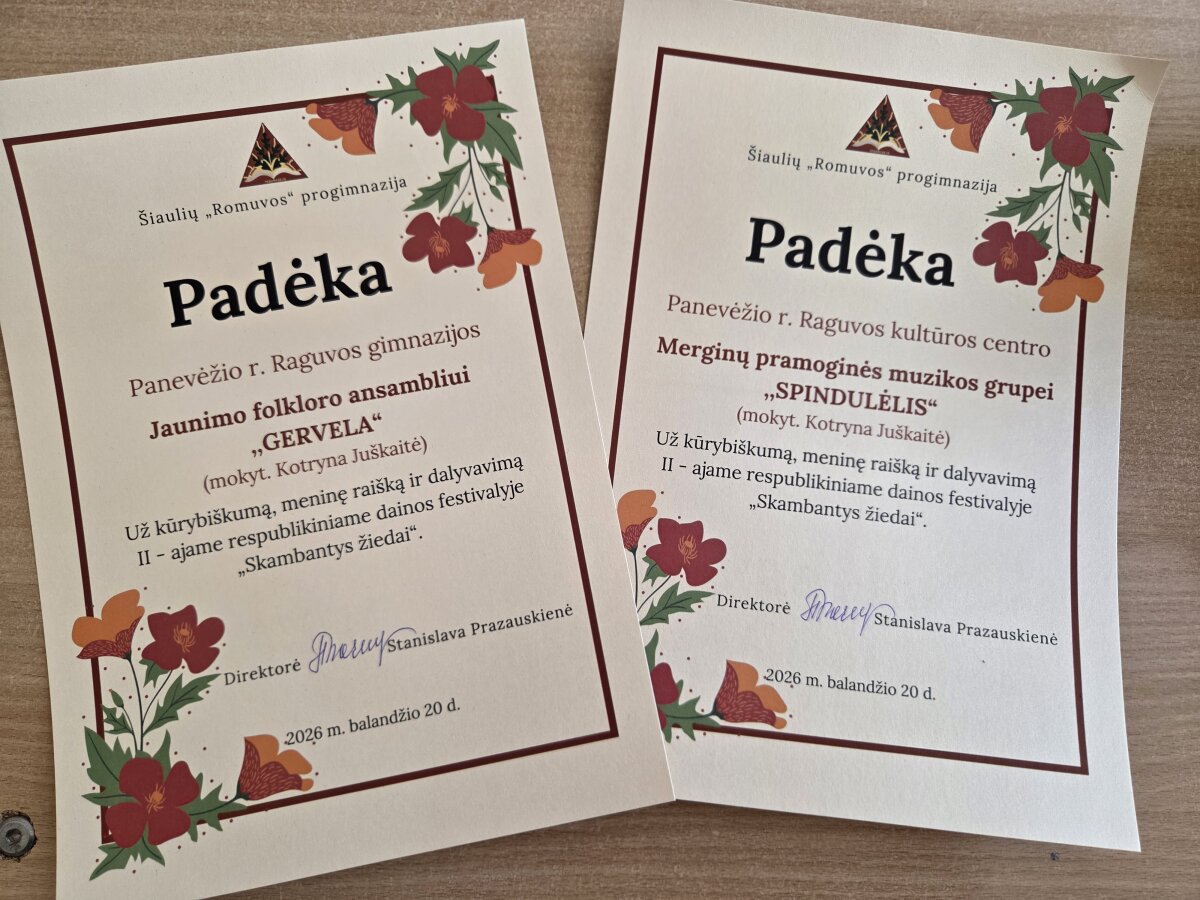 Šiandien Šiaulių „Romuvos“ progimnazijoje įvyko II respublikinis dainų festivalis SKAMBANTYS ŽIEDAI. Šis festivalis subūrė gausų būrį muzikos mylėtojų iš visos Lietuvos. Raguvos gimnaziją ir Raguvos kultūros centrą festivalyje atstovavo I-II g. kl. dainavimo studijos jaunimo folkloro ansamblis GERVELA bei 6-7 kl. merginų pramoginės muzikos grupė SPINDULĖLIS (muzikos mokytoja Kotryna Juškaitė).