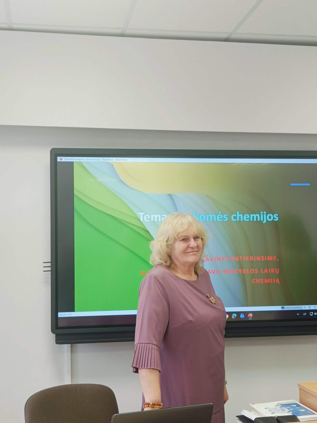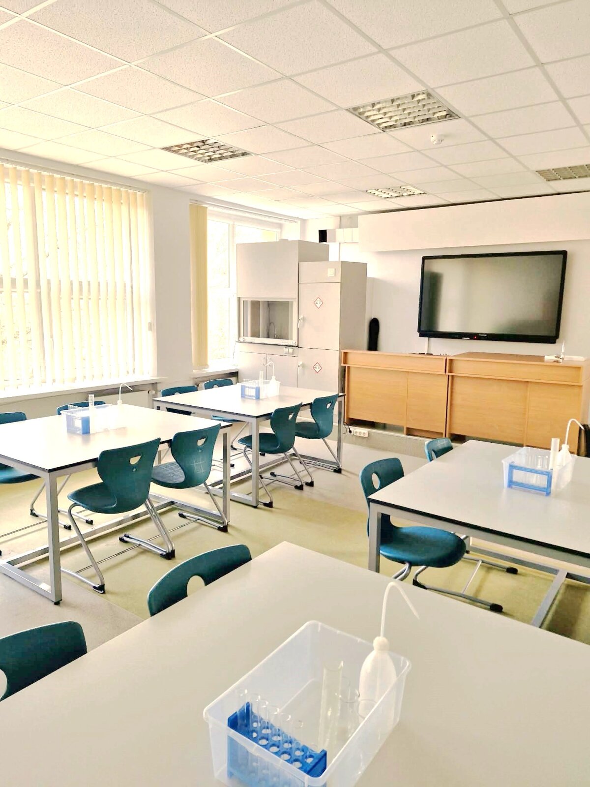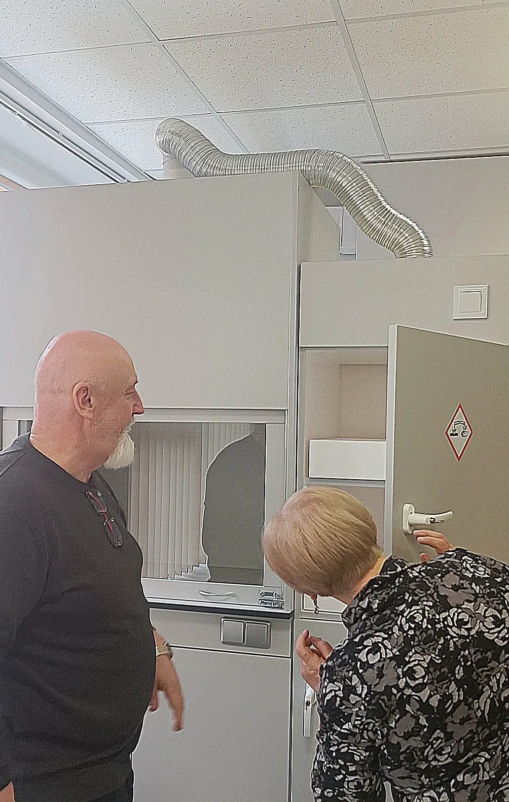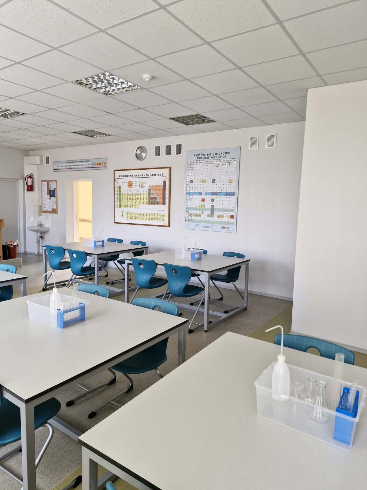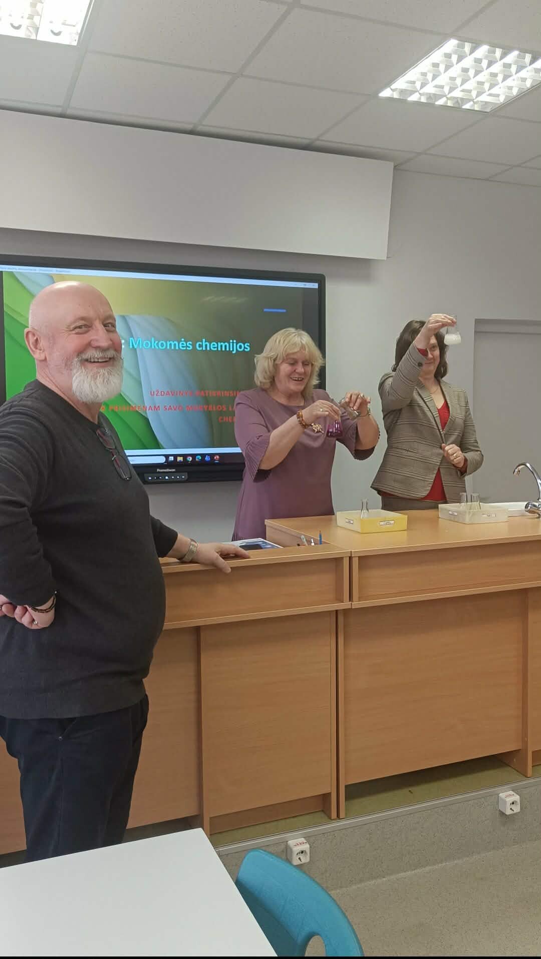 Šiandien gimnazijoje atidaryta moderni chemijos – mokslo, kuris keičia ne tik mąstymą – laboratorijos klasė. Mokytojai buvo pirmieji, kurie dalyvavo pirmoje pamokoje ir drauge su direktore stebėjo kolegių atliekamą chemijos praktinį darbą.