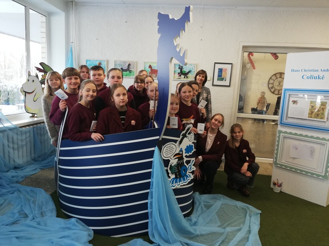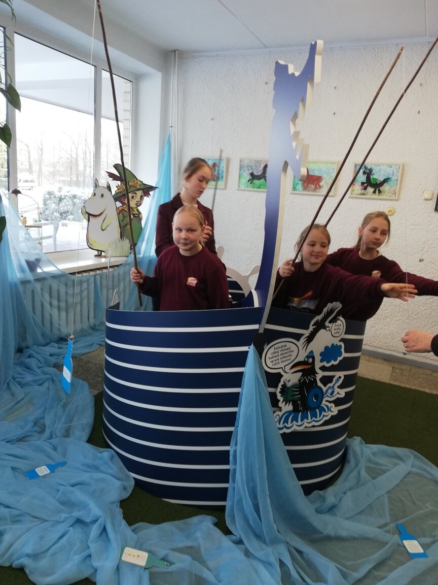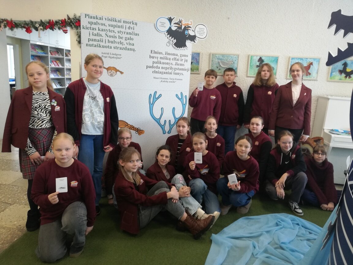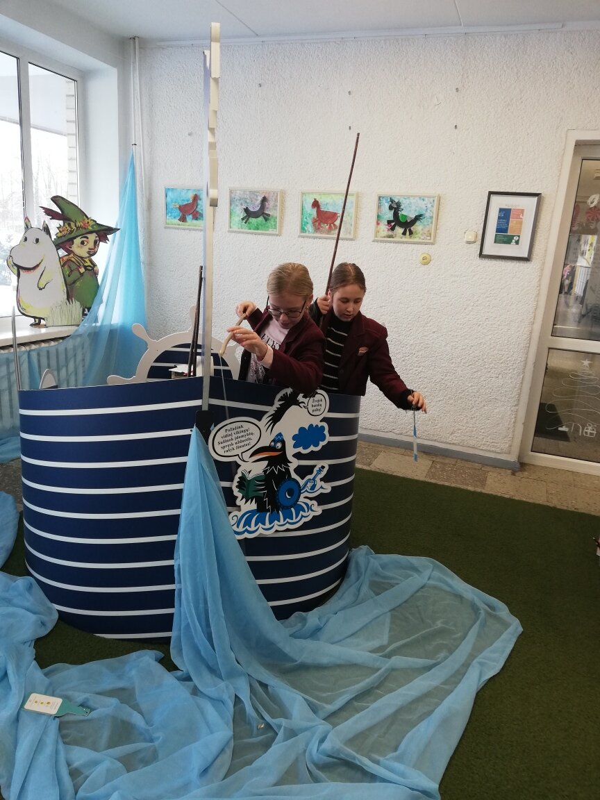 Bibliotekininkė Dalia pakvietė vaikus prisiminti literatūrinius veikėjus – Pepę Ilgakojinę, Karlsoną, Trolius, Puokius ir kitus – bei stendiniame žemėlapyje surasti, iš kurios šalies jie kilę. Poezijos sienoje mokiniai galėjo tapti poetais ir kūrybiškai užbaigti ketureilį. Didžiausią įspūdį paliko smagi užduotis simboliniame laive „sužvejoti“ butelius: vienuose jų slypėjo kūrybinės užduotys, kituose – įdomūs faktai apie vikingus.